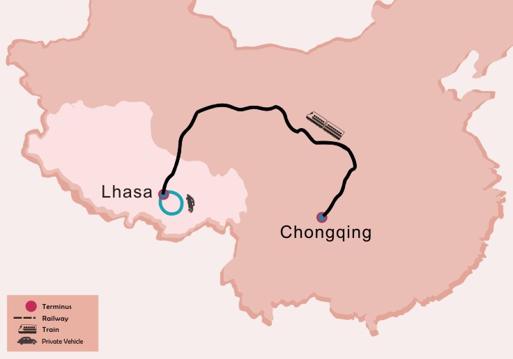 Tonight, you will be driven to Chongqing Railway Station to take your train to Lhasa. Train T222 starts at about 20:18 from Chongqing and arrive at 16:35 on the third day, totally about 43 hours and 50 minutes.