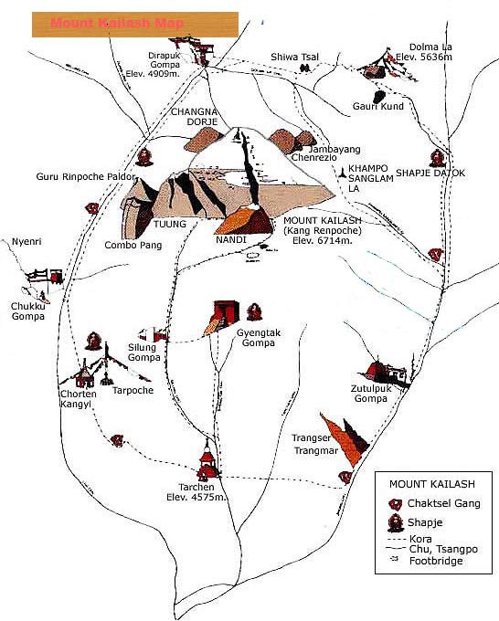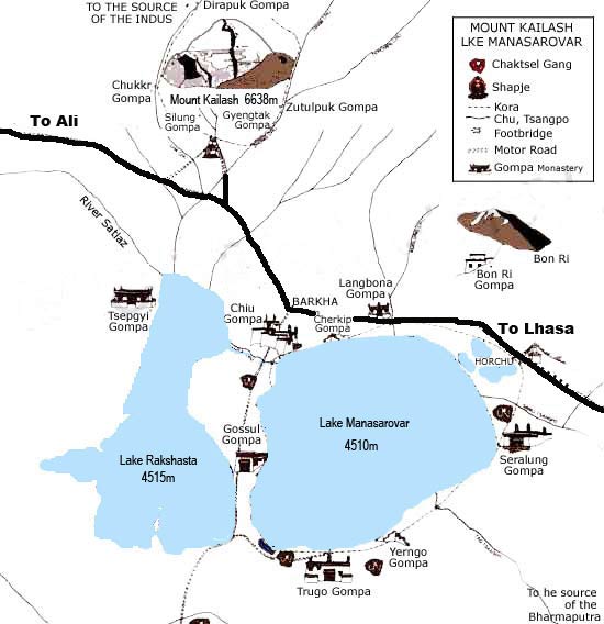 Kailash Manasarovar Map presents the location of Mount Kailash and location of Lake Manasarovar, and surrounding tourist sites.